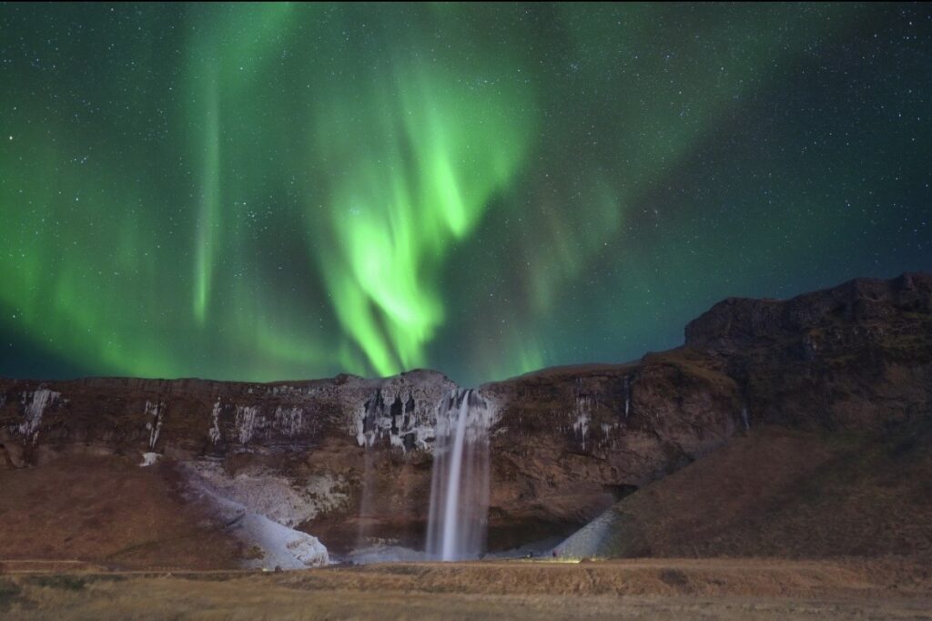 アイスランドの魅力は、オーロラ単体だけじゃなくて、滝・氷河・黒い砂浜・火山地形みたいな大自然と一緒に写せるところ。
